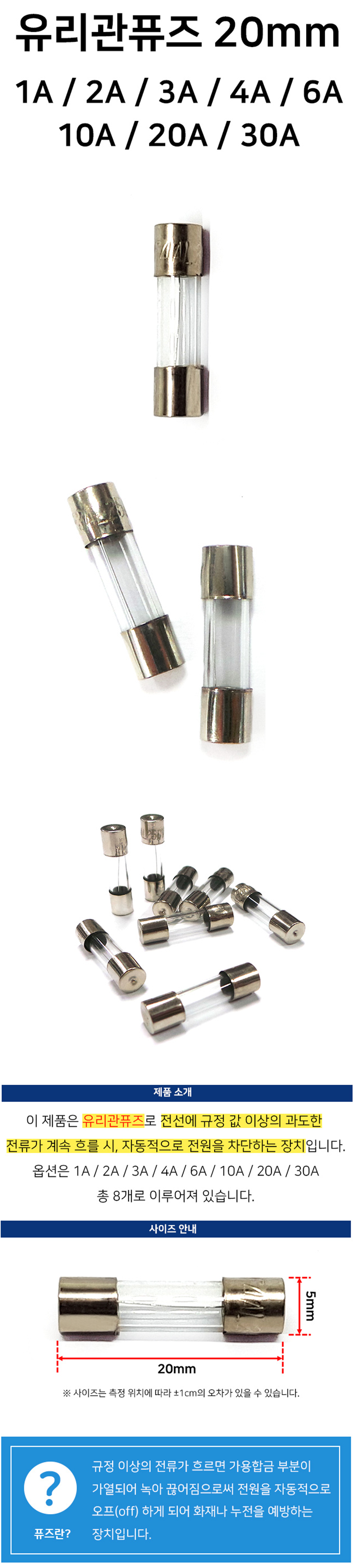 해당 상품은 유리관 퓨즈 20mm로 전선에 규장값 이상의 과도한 전류가 계속 흐를 시, 자동적으로 전원을 차단하는 장치입니다.