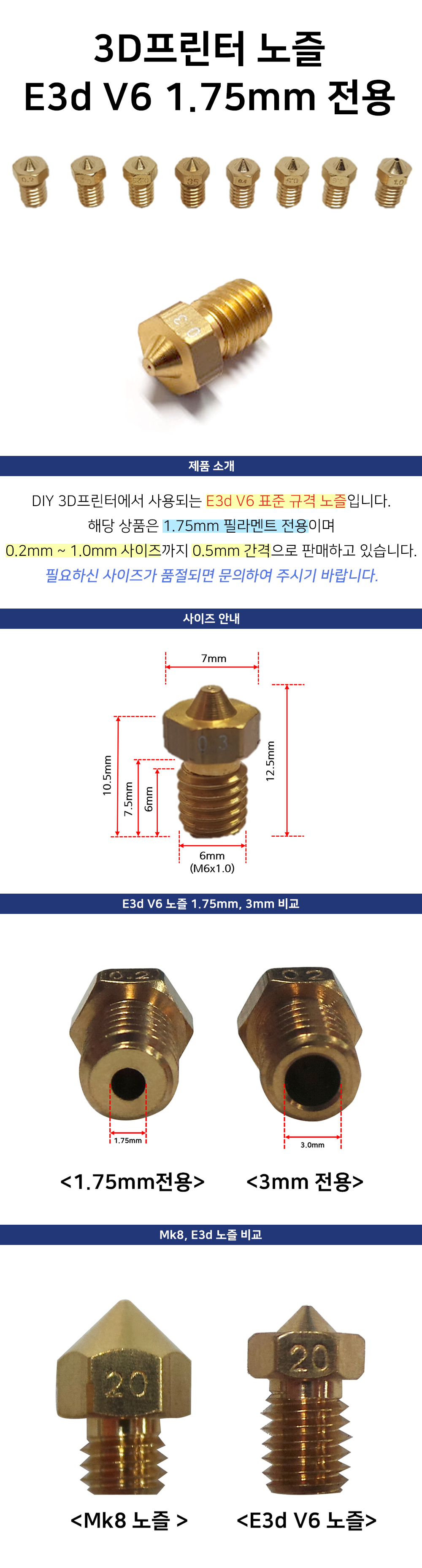 해당 상품은 1.75mm 필라멘트 전용이며 0.2mm ~ 1.0mm 사이즈까지 0.5mm 간격으로 판매하고 있습니다.
