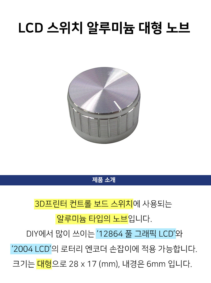 DIY에서 많이 쓰이는 '12864 풀 그래픽 LCD'와 '2004 LCD'의 로터리 엔코더 손잡이에 적용가능합니다.