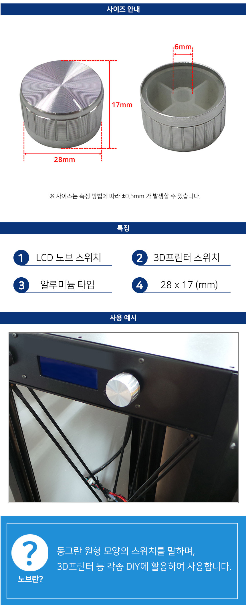 3D프린터 컨트롤 보드 스위치에 사용되는 알루미늄 타입의 노브입니다.