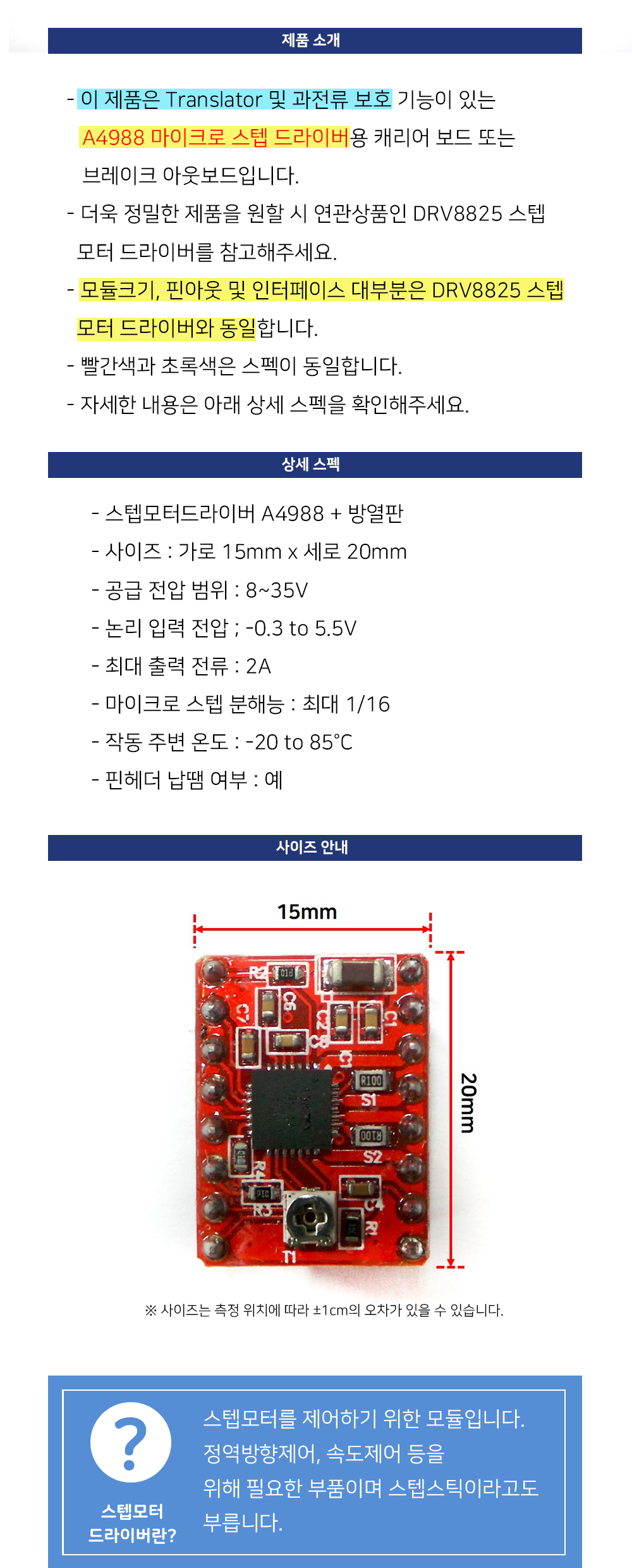 해당 제품은 Translator 및 과전류 보호 기능이 있는 A4988 마이크로 스텝드라이버용 캐리어보드 또는 브레이크 아웃보드입니다.