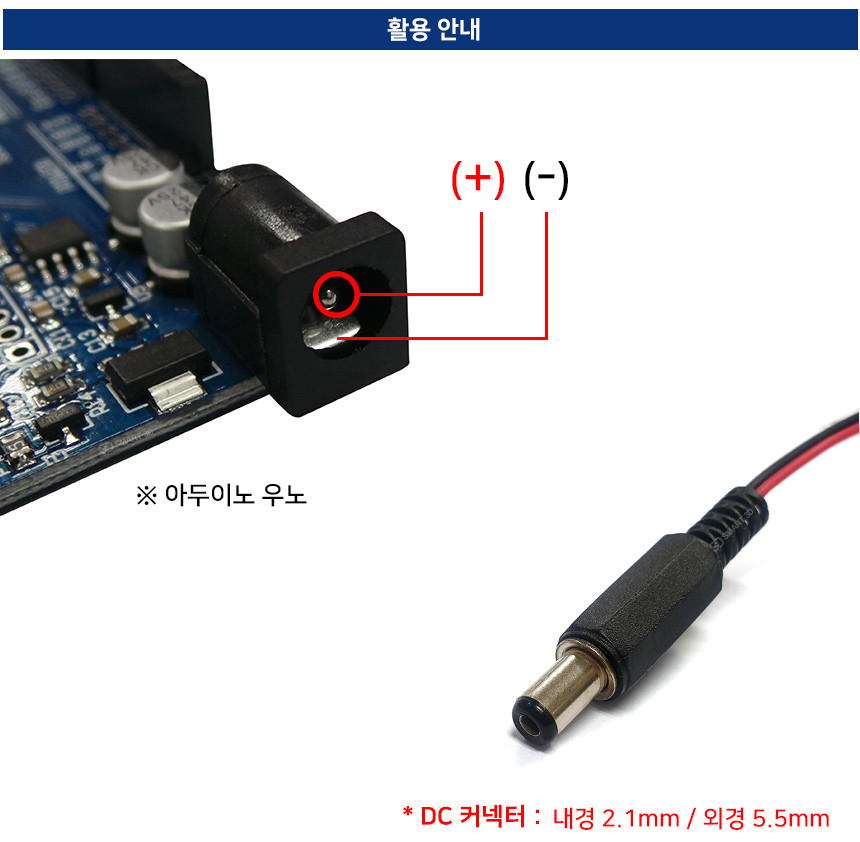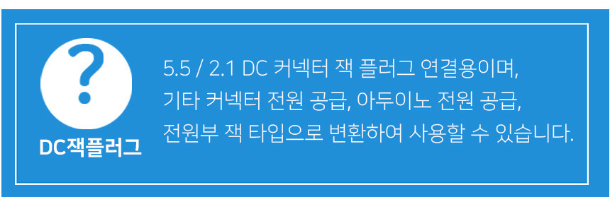 DC커넥터 전원 공급, 아두이노 전원 공급, 전원부 잭 타입으로 변환하여 사용할 수 있으며, 브레드 보드에 연결하여 함께 사용 가능합니다.