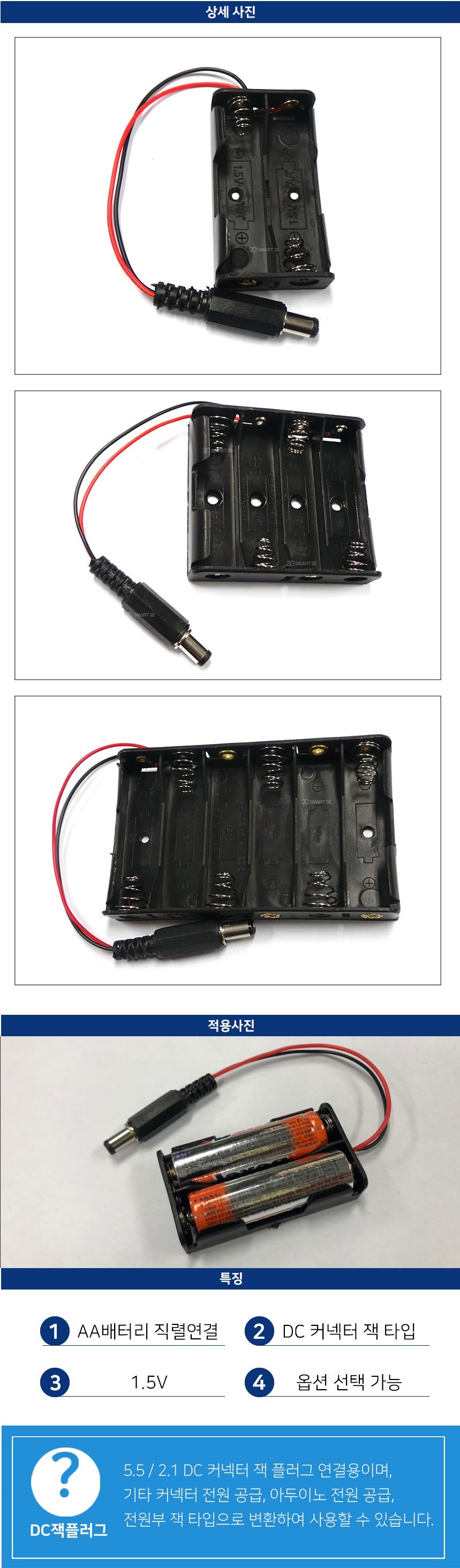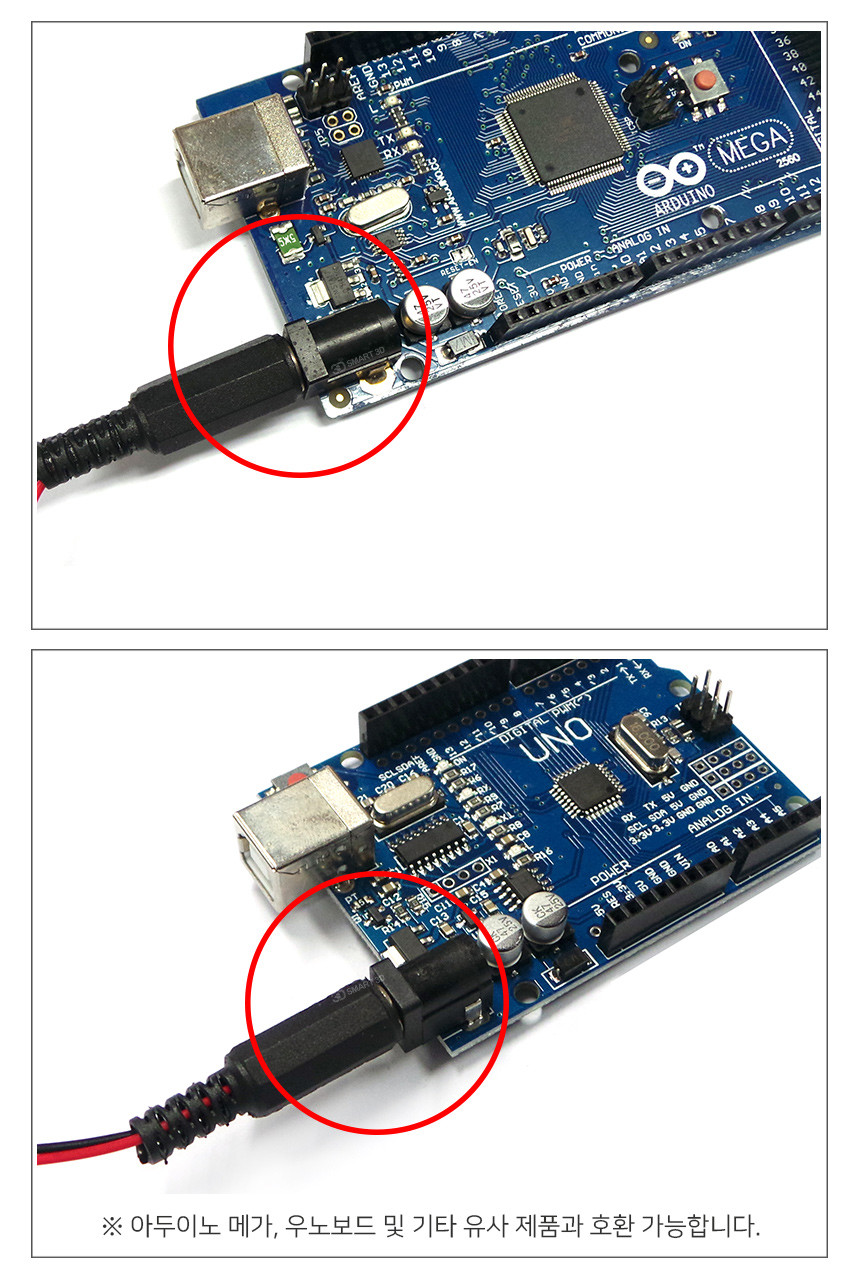 DC 커넥터 전원 공급, 아두이노 전원 공급, 전원부 잭 타입으로 변환하여 사용할 수 있습니다.
