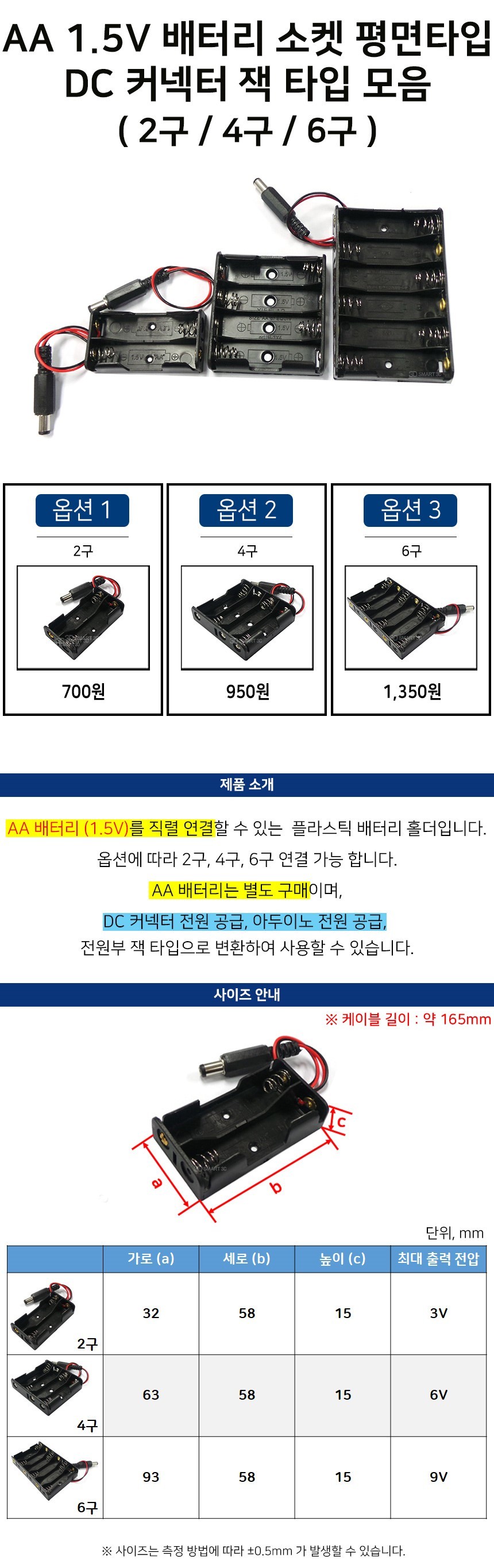 AA 배터리 (1.5V)를 직렬 연결할 수 있는 플라스틱 배터리 홀더입니다. 옵션에 따라 2구, 4구, 6구 연결 가능 합니다.