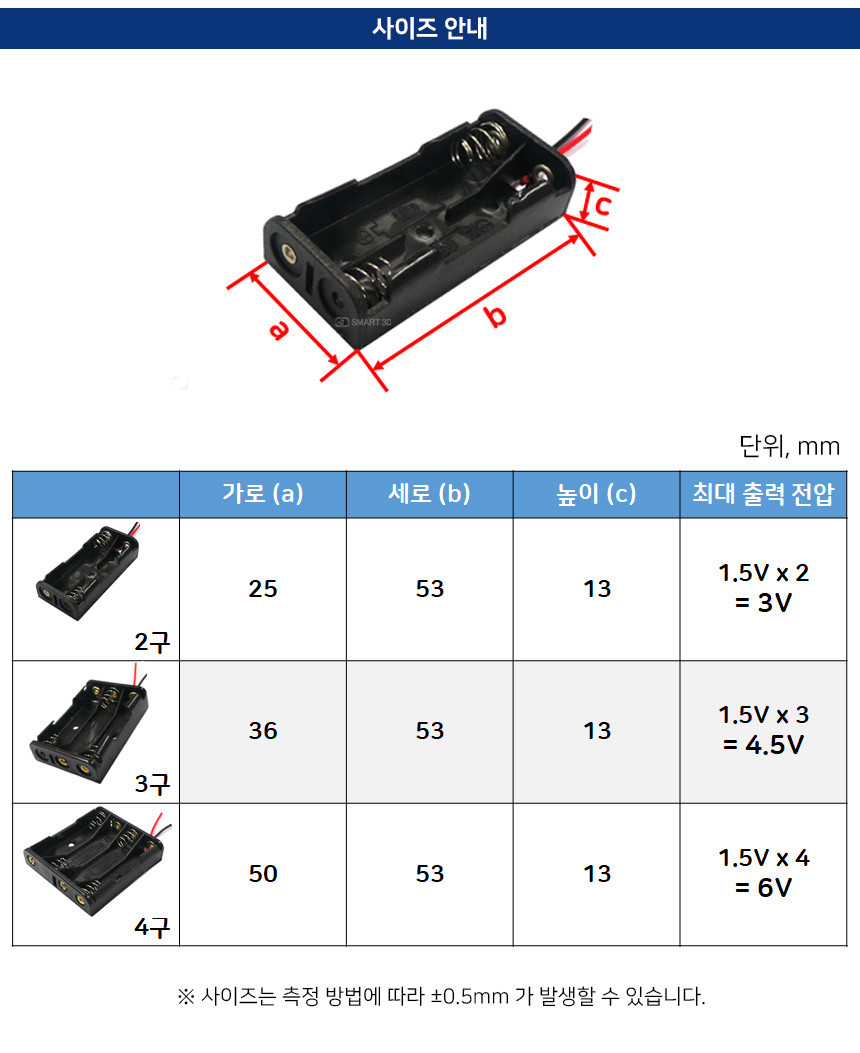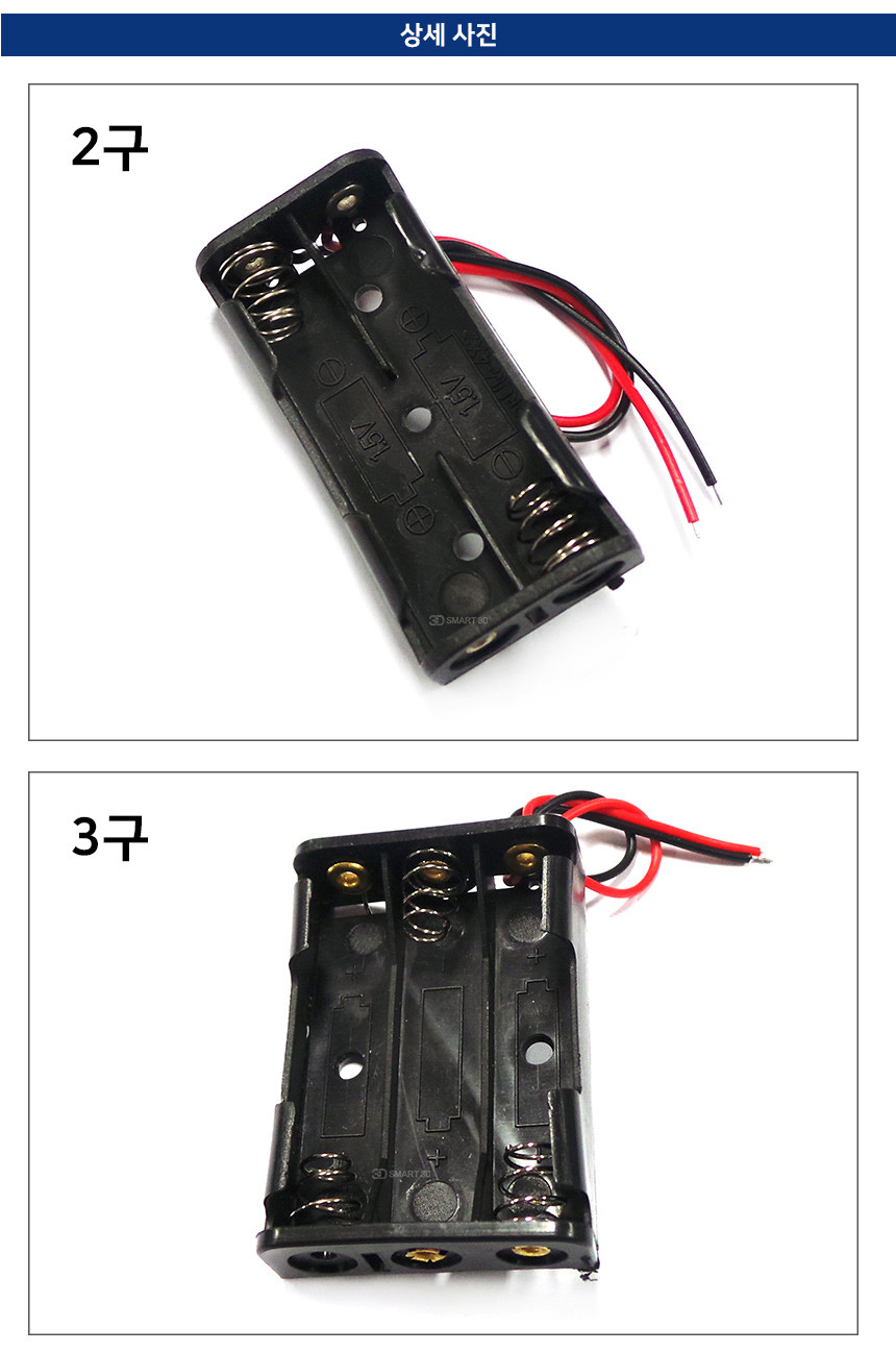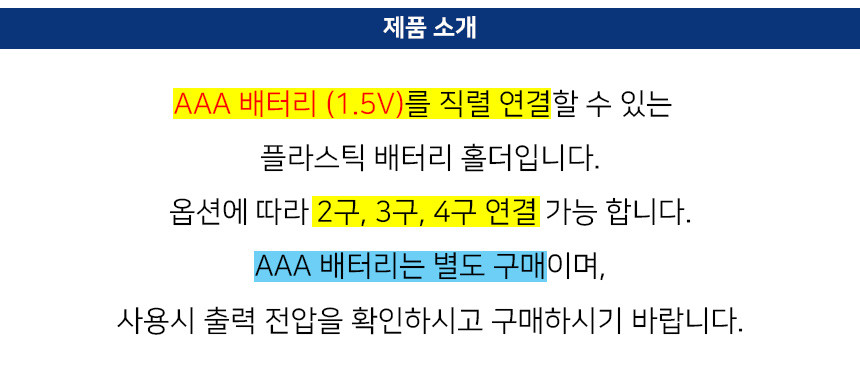 AAA 배터리 (1.5V)를 직렬 연결할 수 있는 플라스틱 배터리 홀더입니다.