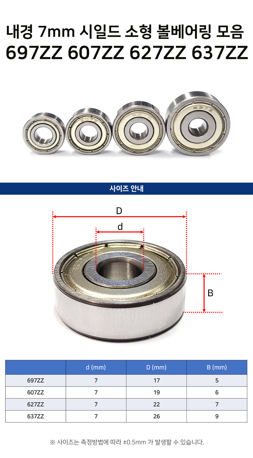 [내경 7mm] 시일드 소형 볼 베어링 모음 697ZZ 607ZZ 627ZZ 637ZZ