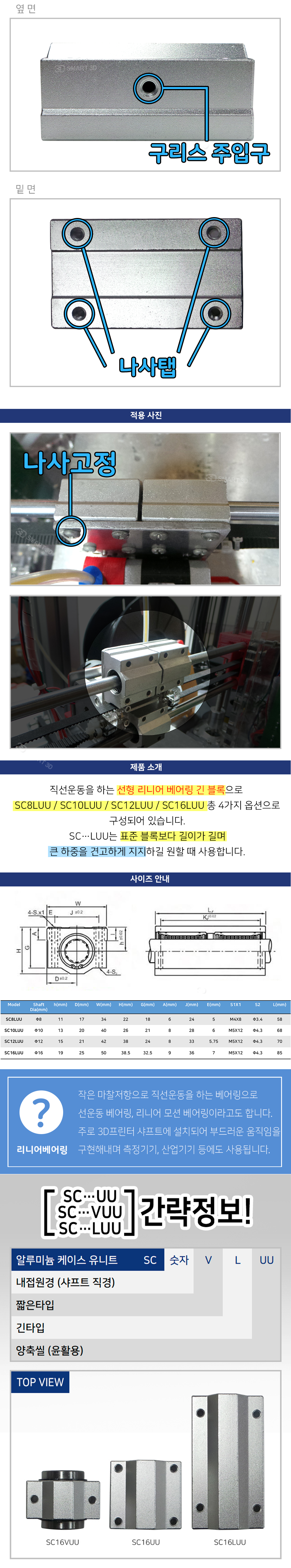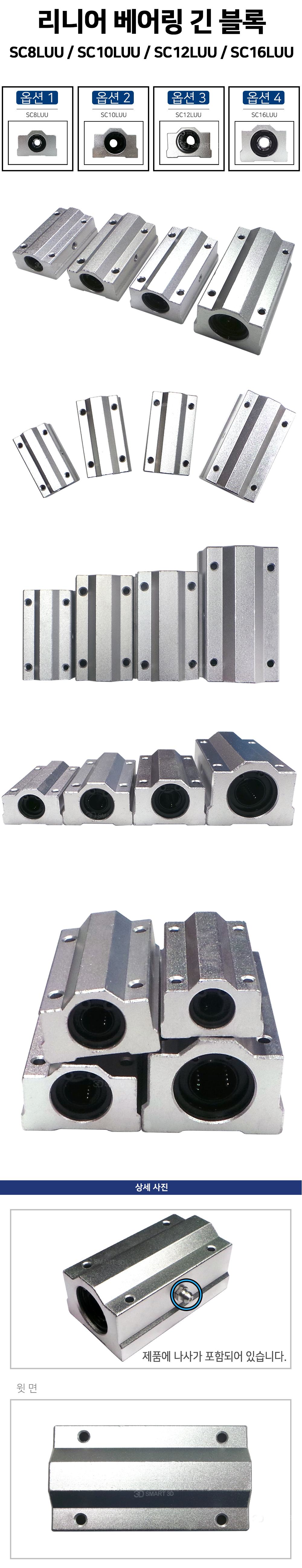 직선운동을 하는 선형 리니어 베어링 긴 블록으로 SC8LUU, SC10LUU, SC12LUU, SC16LUU 총 4가지 옵션으로 구성되어 있습니다.