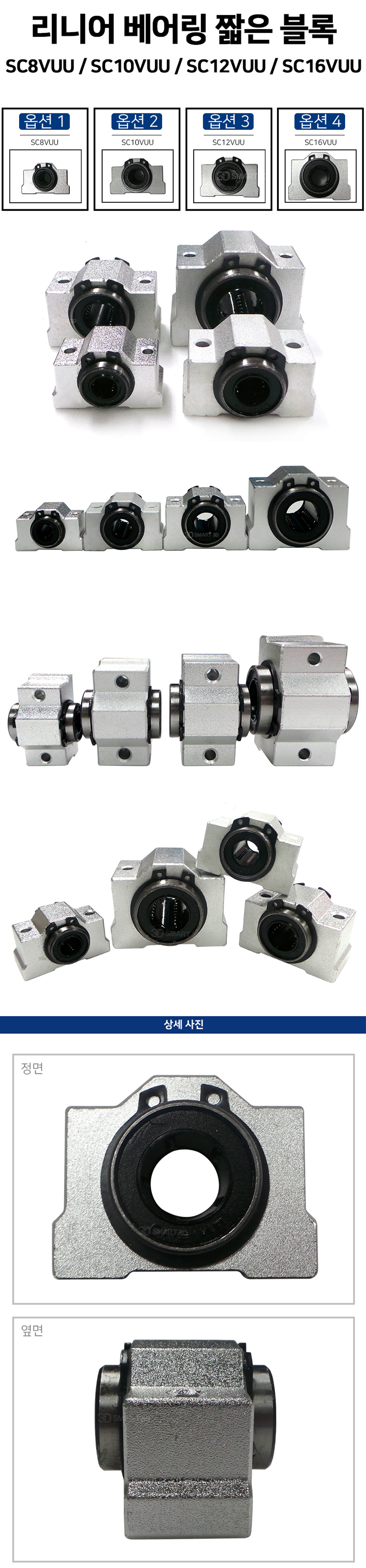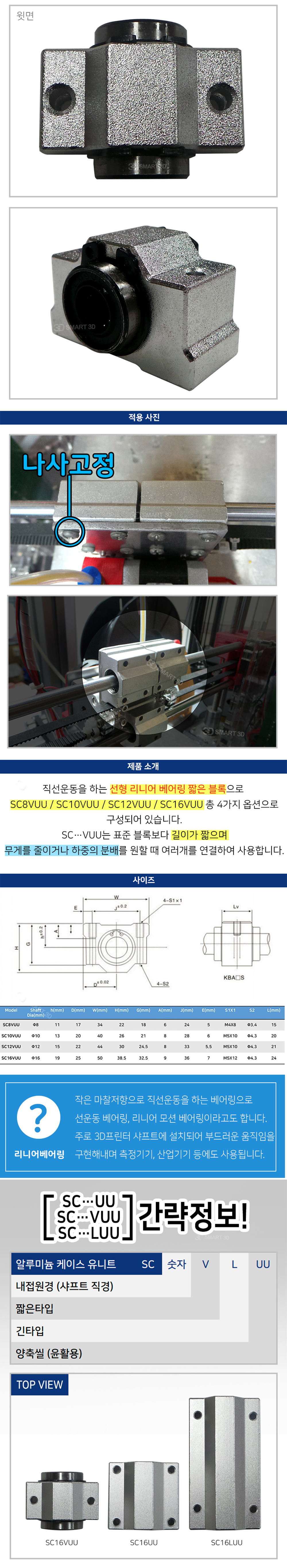 직선운동을 하는 선형 리니어 베어링 짧은 블록으로 SC8VUU, SC10VUU, SC12VUU, SC16VUU 총 4가지 옵션으로 구성되어 있습니다.