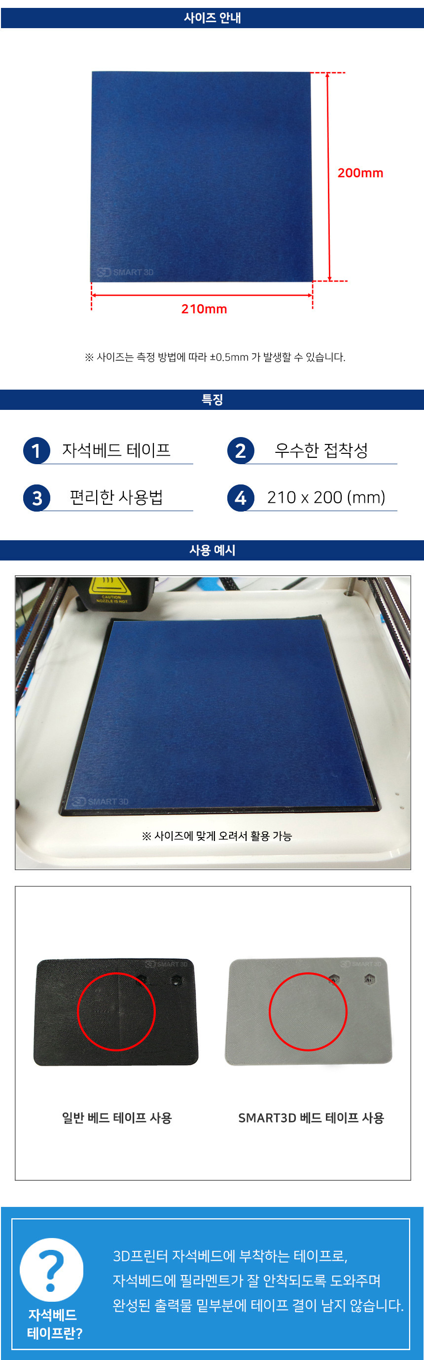 3D프린터 사용 시 자석 베드에 테이프를 붙이면 출력물 바닥에 테이프 결에 안보이므로 깔끔하게 출력할 수 있습니다.