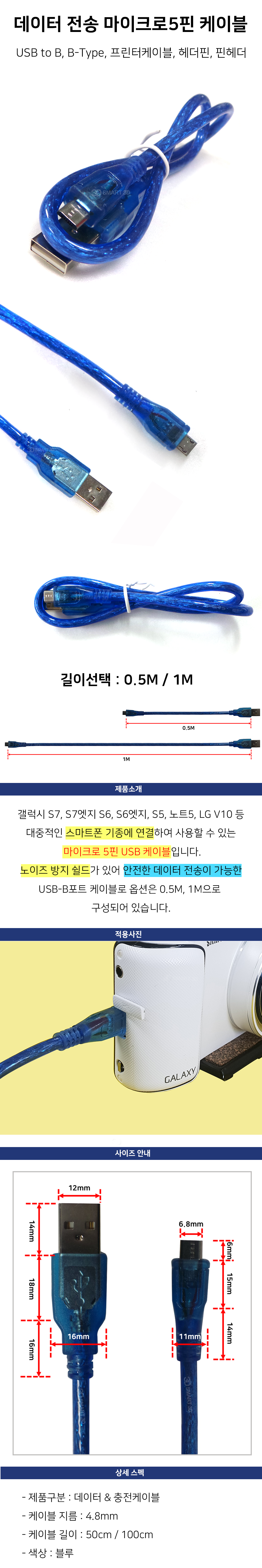 대중적인 스마트폰 기종에 연결하여 사용할 수 있는 마이크로 5핀 USB 케이블입니다.