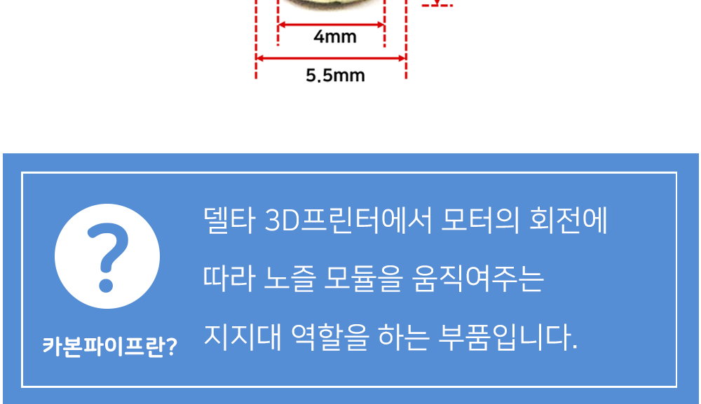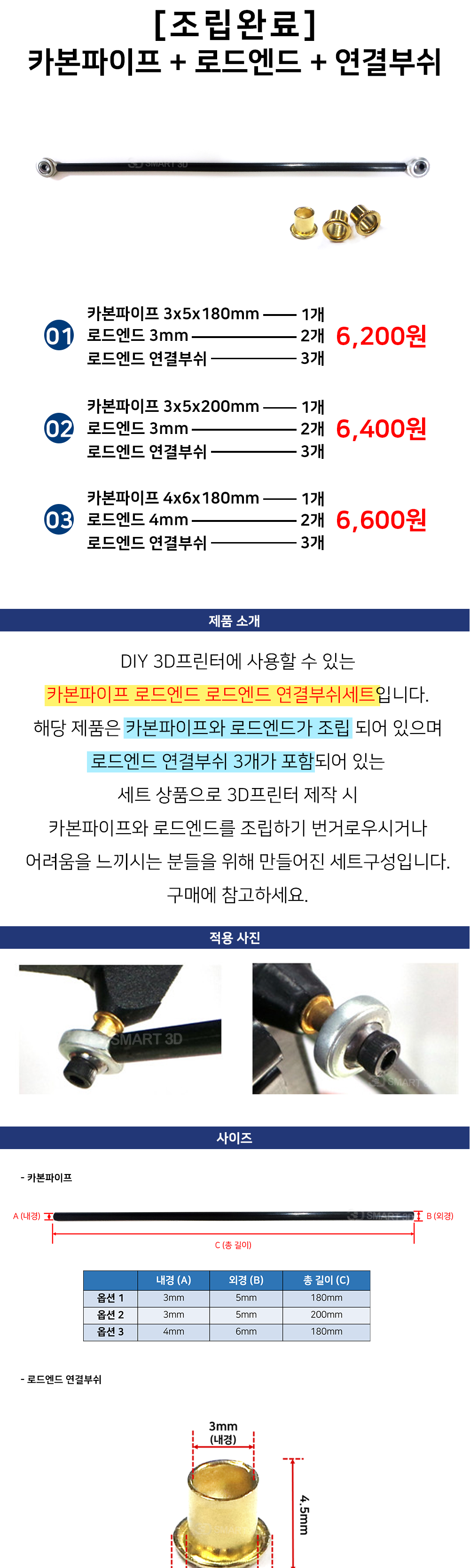 해당제품은 카본파이프와 로드엔드가 조립되어 있으며 로드엔드 연결부쉬 3개가 포함되어 있는 세트 상품으로 3D프린터 제작시 카본파이프와 로드엔드를 조립하기 번거로우시거나 어려움을 느끼시는 분들을 위해 만들어진 세트구성입니다.