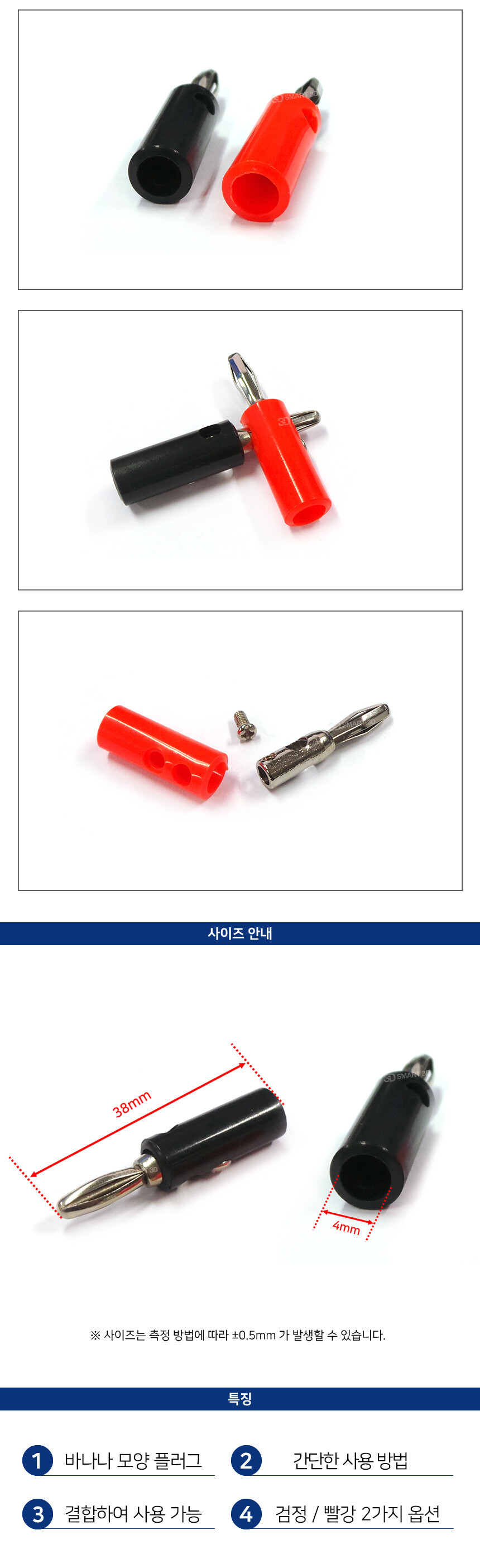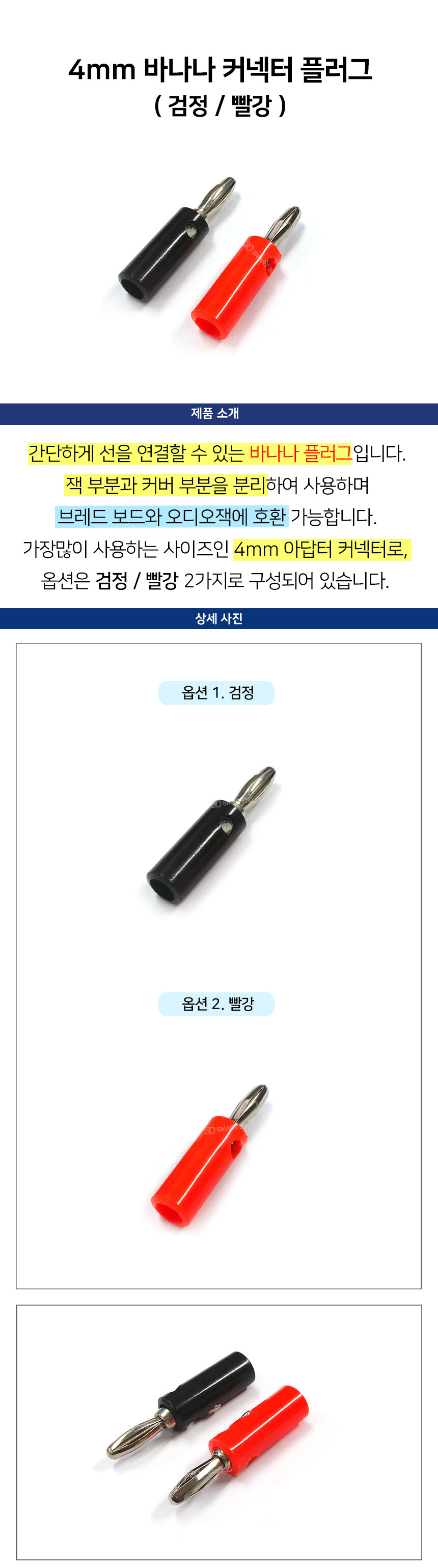 가장 많이 사용하는 사이즈인 4mm 아답터 커넥터로 옵션은 검정 / 빨강 2가지로 구성되어 있습니다.