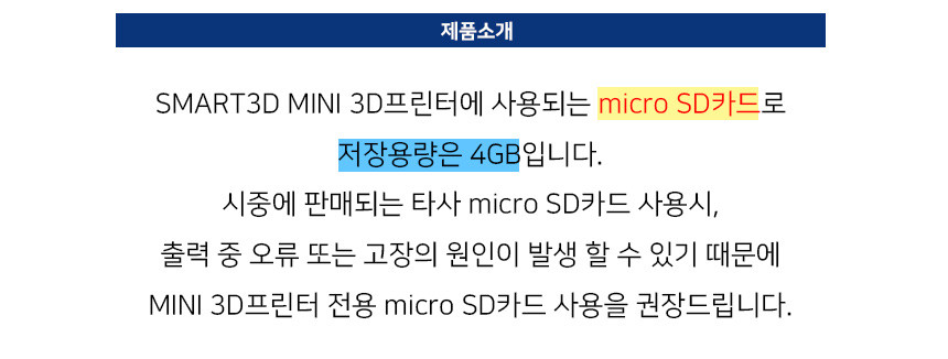 시중에 판매되는 타사 micro SD카드 사용시, 출력중 오류 또는 고장의 원인이 발생할 수 있기 때문에 MINI 3D프린터 전용 micro SD카드 사용을 권장드립니다.