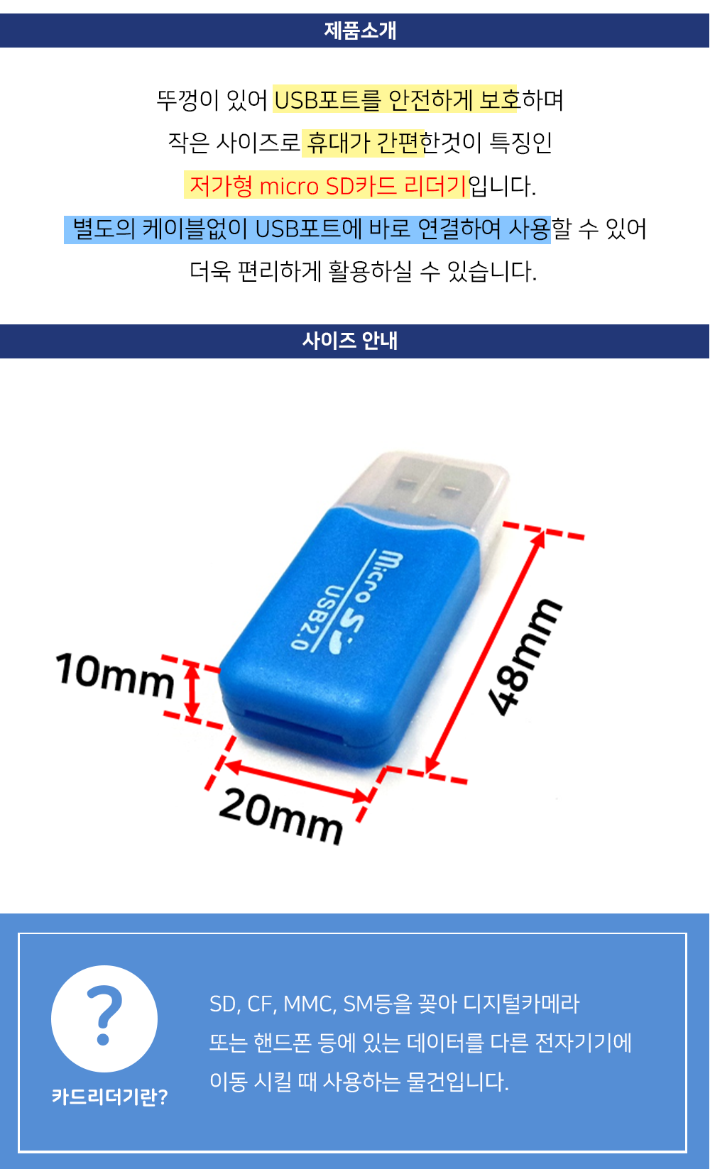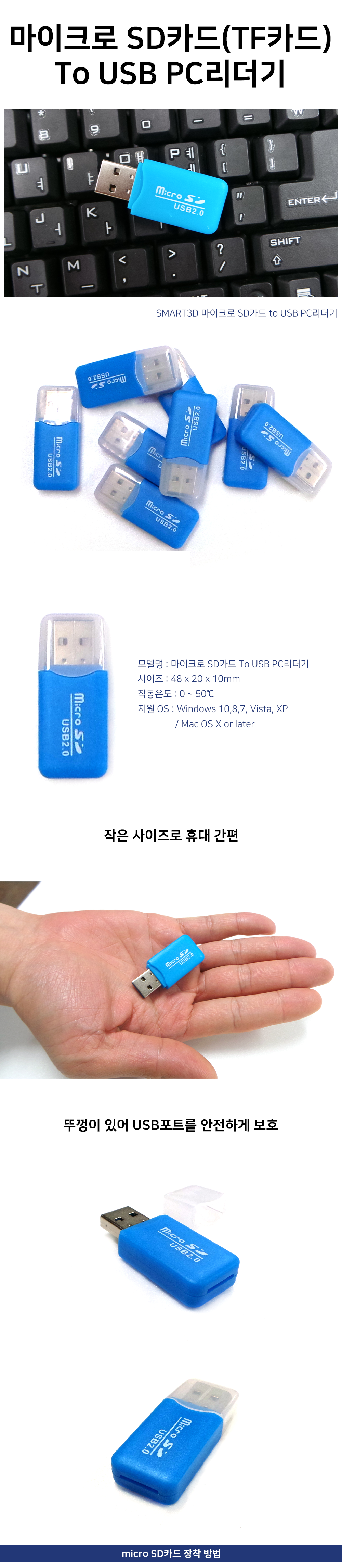 뚜껑이 있어 USB포트를 안전하게 보호하며 작은 사이즈로 휴대가 간편한 것이 특징인 저가형 micro SD카드 리더기입니다.