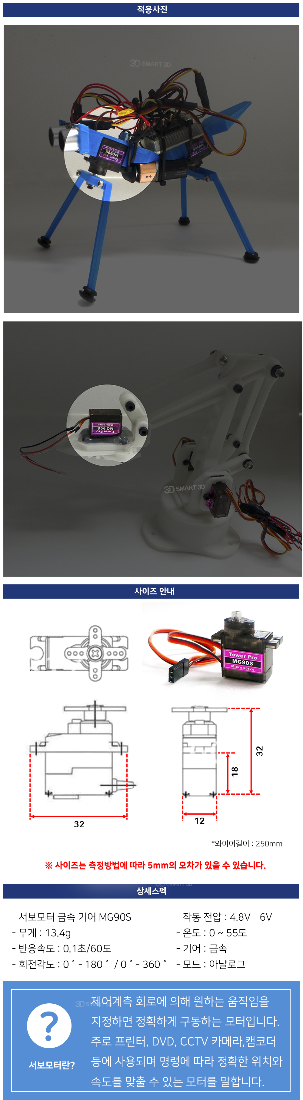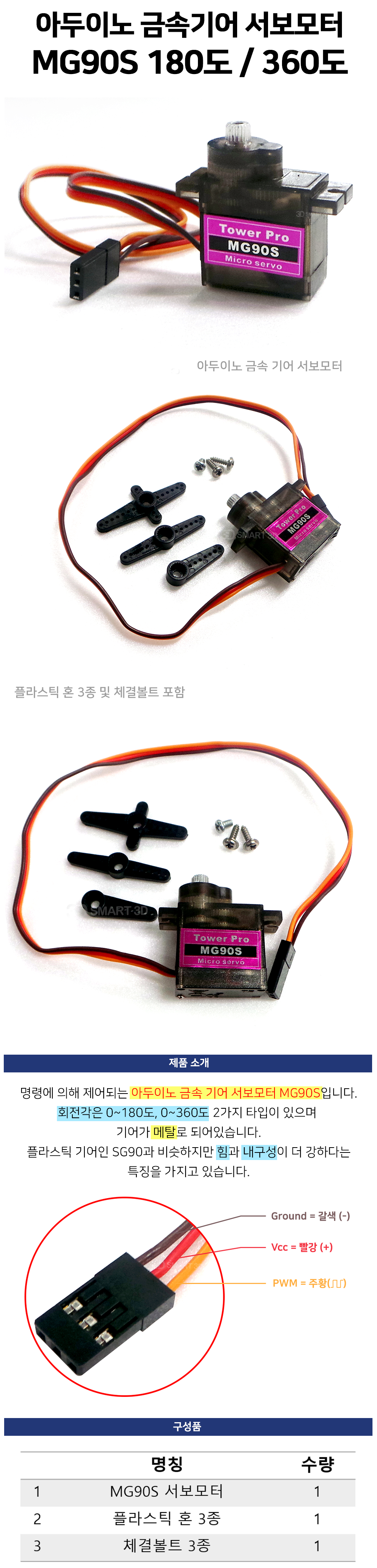 플라스틱 기어인 SG90과 비슷하지만 힘과 내구성이 더 강하다는 특징을 가지고 있습니다.