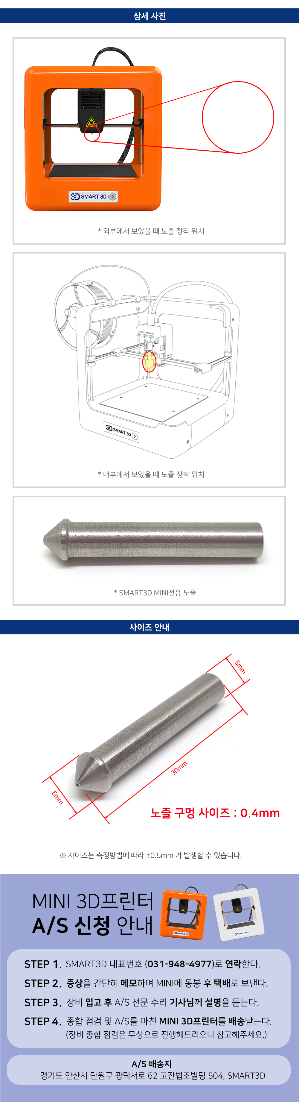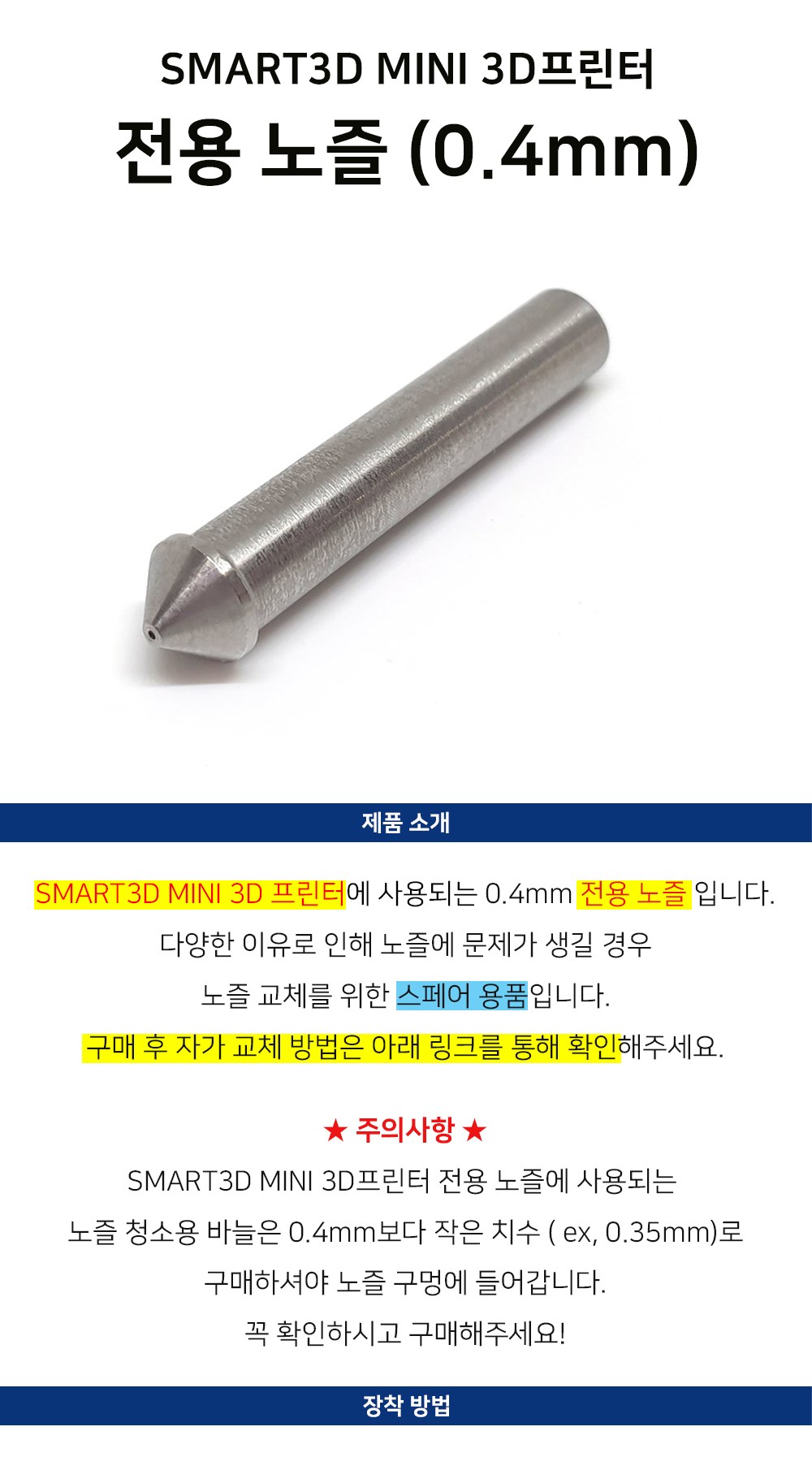 SMART3D MINI 3D프린터에 사용되는 0.4mm 전용 노즐입니다.