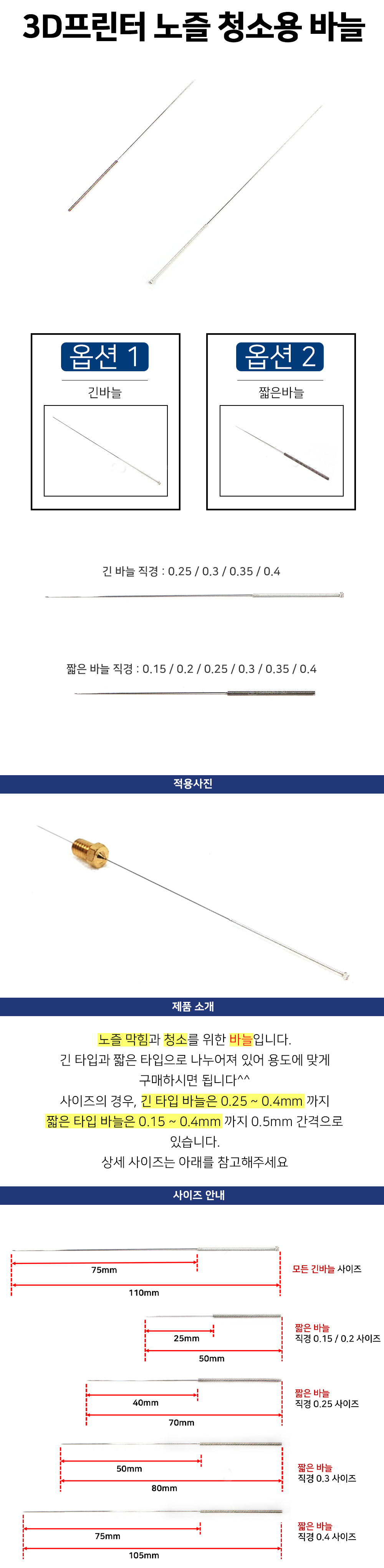 사이즈의 경우 긴타입 바늘은 0.25~0.4mm까지, 짧은 타입 바늘은 0.15~0.4mm까지 0.5mm 간격으로 있습니다.