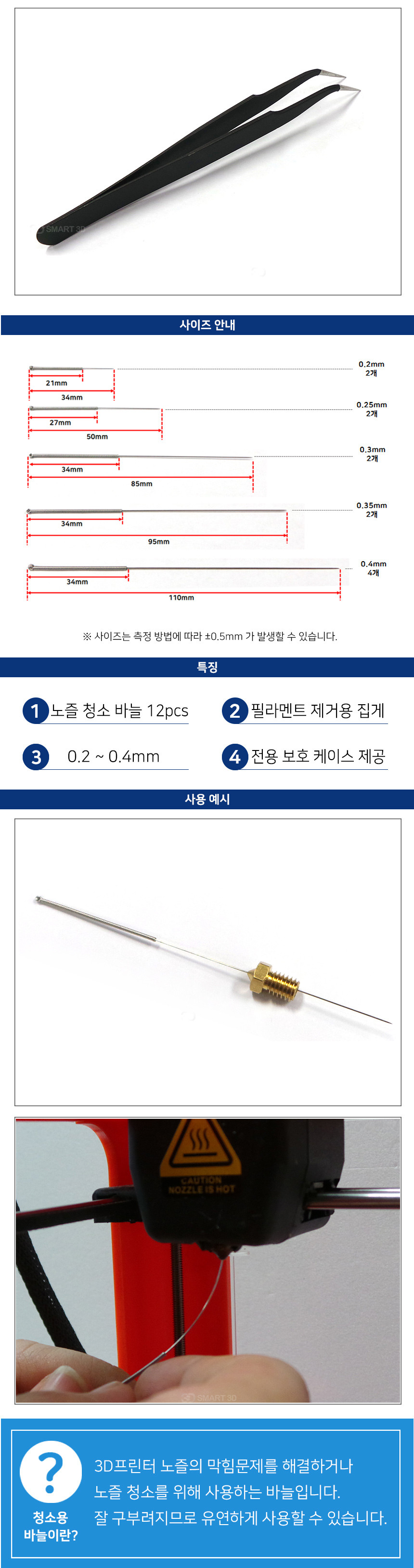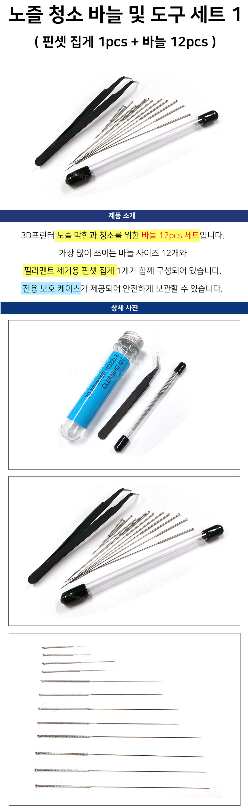 노즐 청소 바늘 및 도구 종합 세트1 키트 바늘 12pcs (0.2mm / 0.25mm / 0.3mm / 0.35mm / 0.4mm) + 필라멘트 제거용 핀셋 집게 1pc + 보호용 전용 보관통 3D프린터 3D펜 (스마트3D)