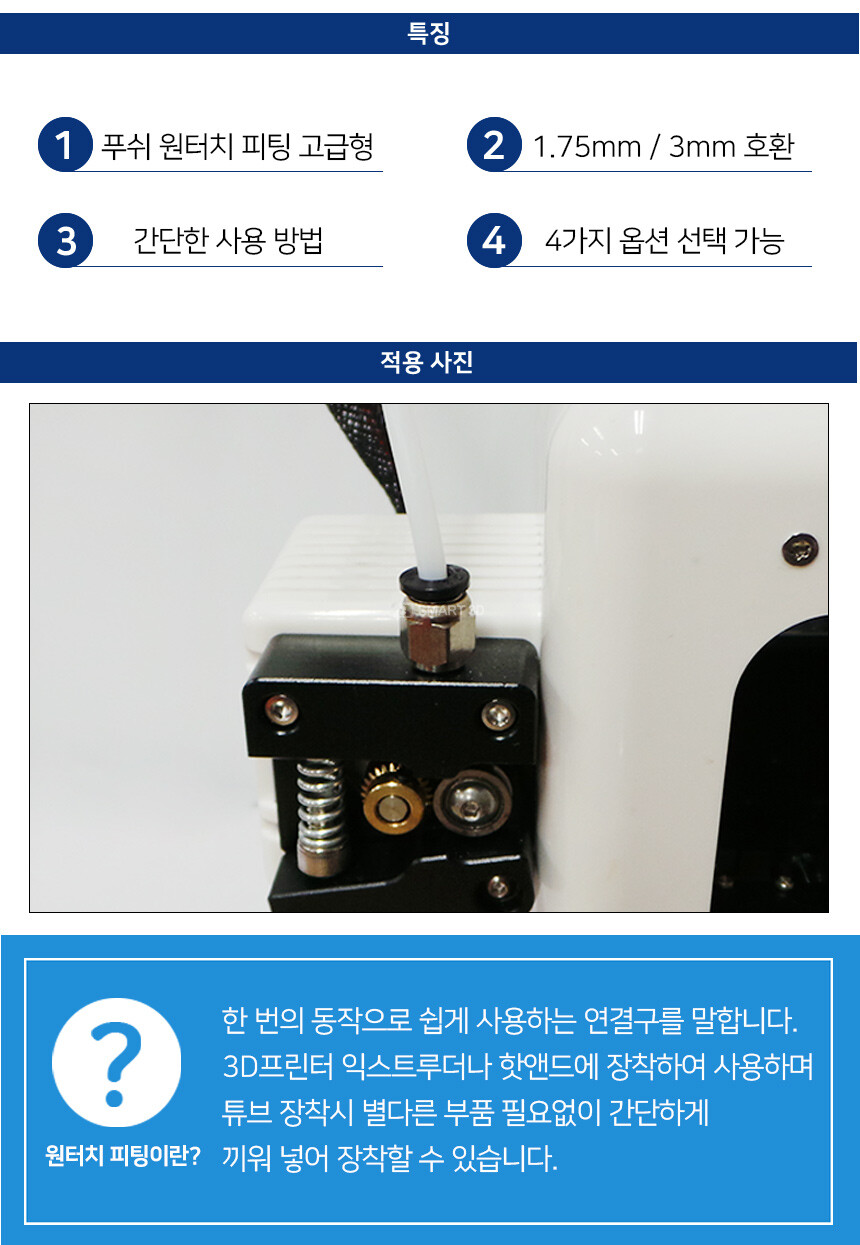 3D프린터에서 많이 사용되는 규격이며 익스트루더나 핫앤드에 장착해서 사용합니다. 본 제품은 진공압에서도 사용 가능하며, 사용시 튜브를