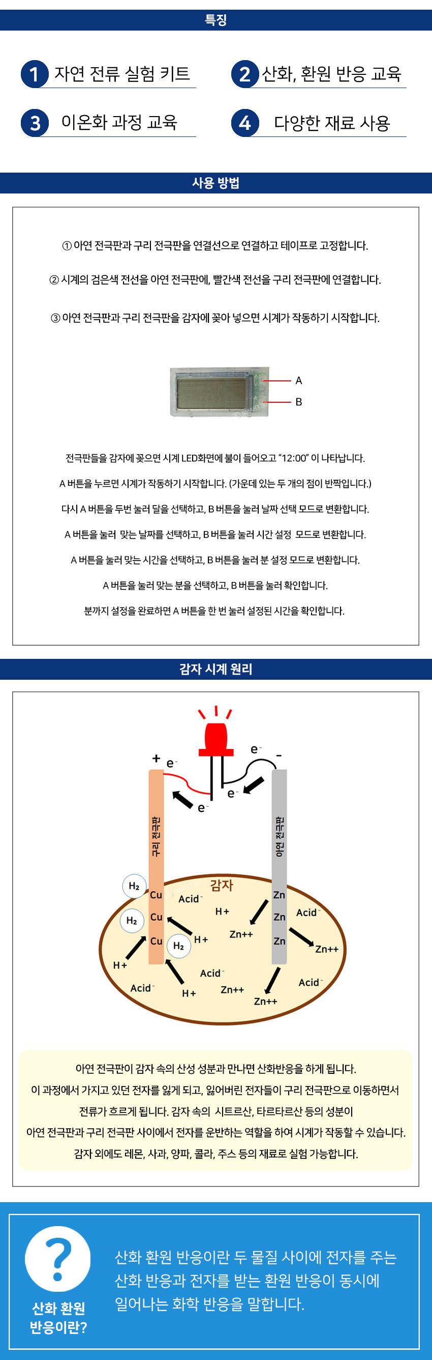 구리와 아연 전극판을 이용하여 산화,환원 작용으로 자연 전류를 발생시켜 작동하는 실험 키트입니다.