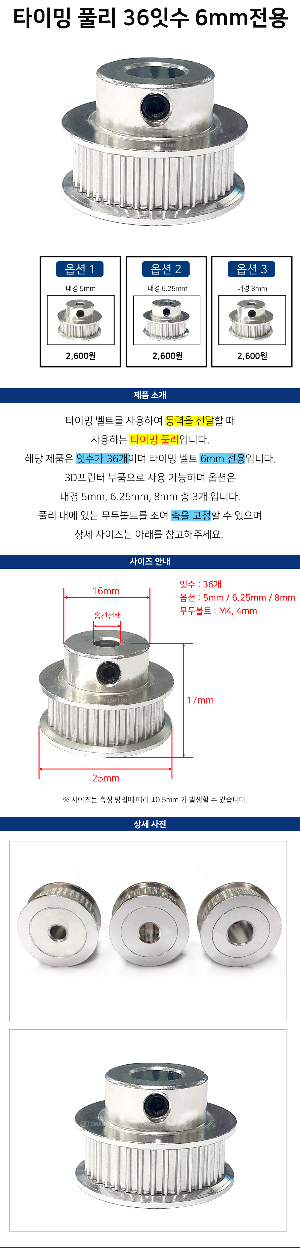 해당 제품은 잇수가 36개이며 타이밍 벨트 6mm전용입니다.