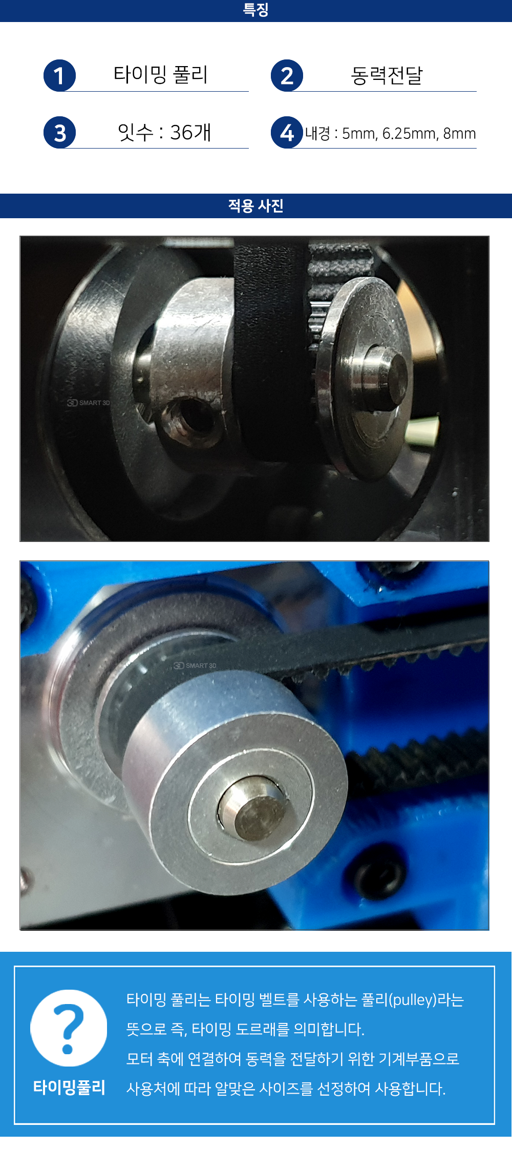 타이밍 벨트를 사용하여 동력을 전달할 때 사용하는 타이밍 풀리입니다.
