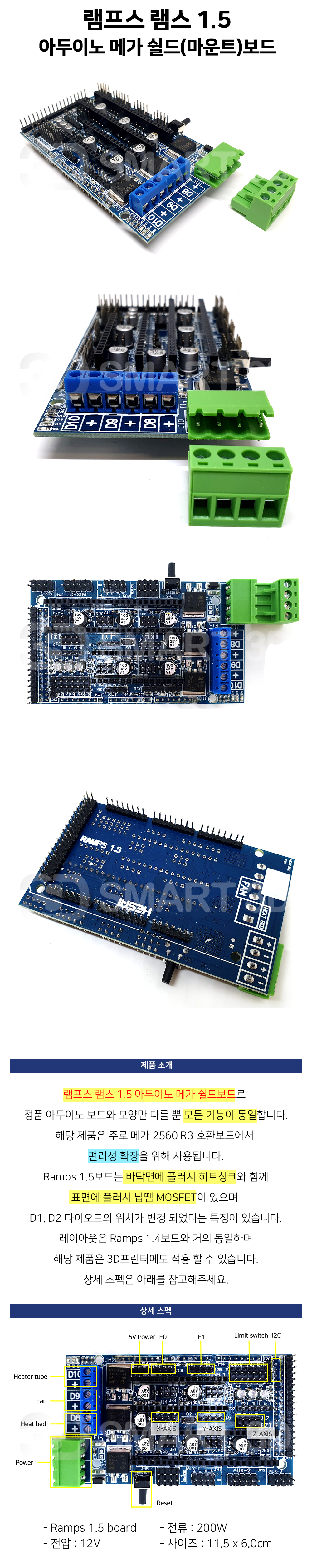램프스 램스 1.5 아두이노 메가 쉴드보드로 정품 아두이노 보드와 모양만 다를 뿐 모든 기능이 동일합니다.