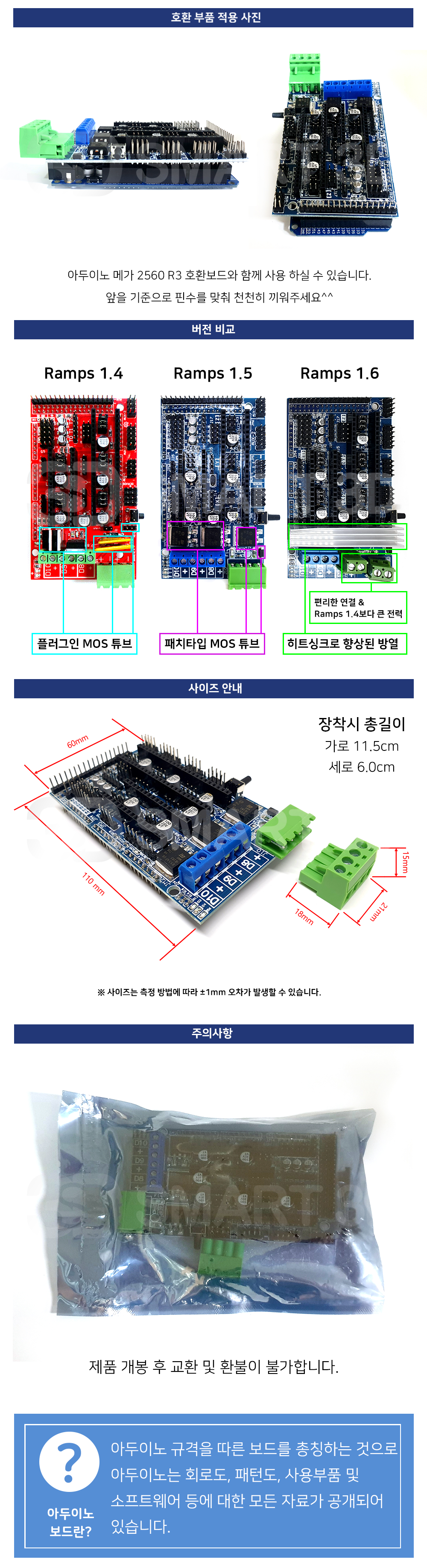 해당 제품은 주로 메가 2560 R3 호환보드에서 편리성 확장을 위해 사용됩니다.