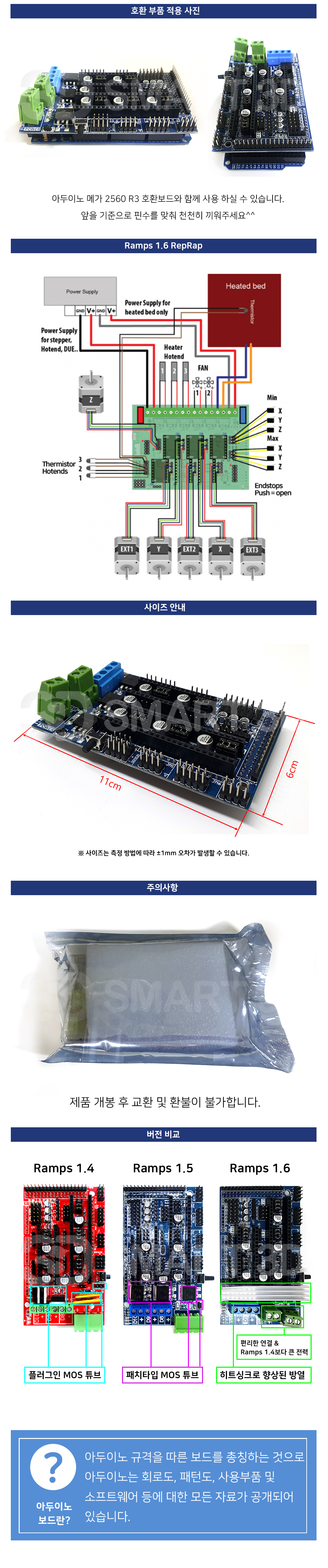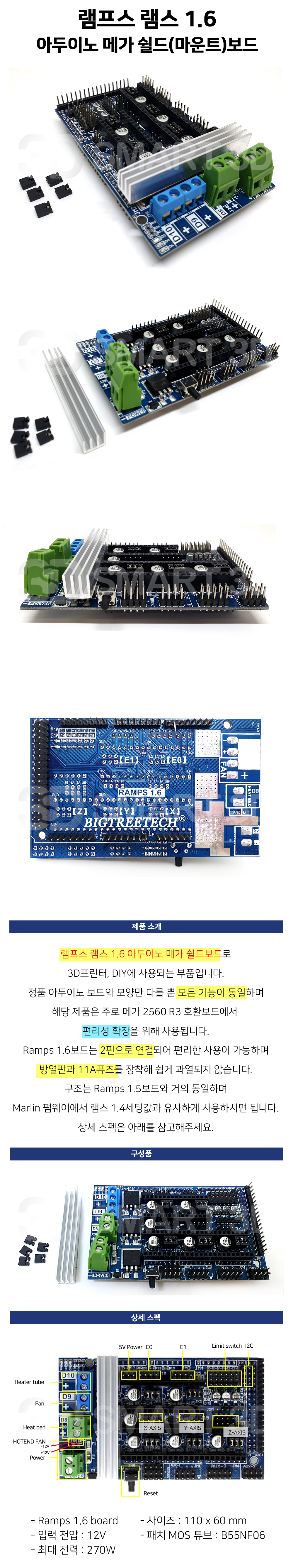 램프스 램스 1.6 아두이노 메가 쉴드보드로 3D프린터, DIY에 사용되는 부품입니다. 정품 아두이노 보드와 모양만 다를 뿐 모든 기능이 동일하며 해당 제품은 주로 메가 2560 R3 호환보드에서 편리성 확장을 위해 사용됩니다. Ramps 1.6 보드는 2핀으로 연결되어 편리한 사용이 가능하며 방열판과 11A 퓨즈를 장착해 쉽게 과열되지 않습니다. 구조는 Ramps 1.5보드와 거의 동일하며 Marlin 펌웨어에서 램스 1.4 세팅값과 유사하게 사용하시면 됩니다.