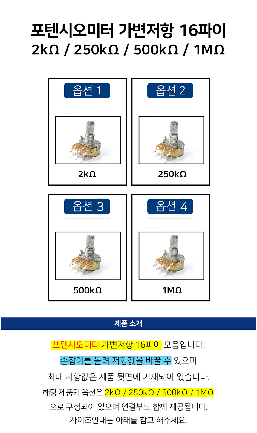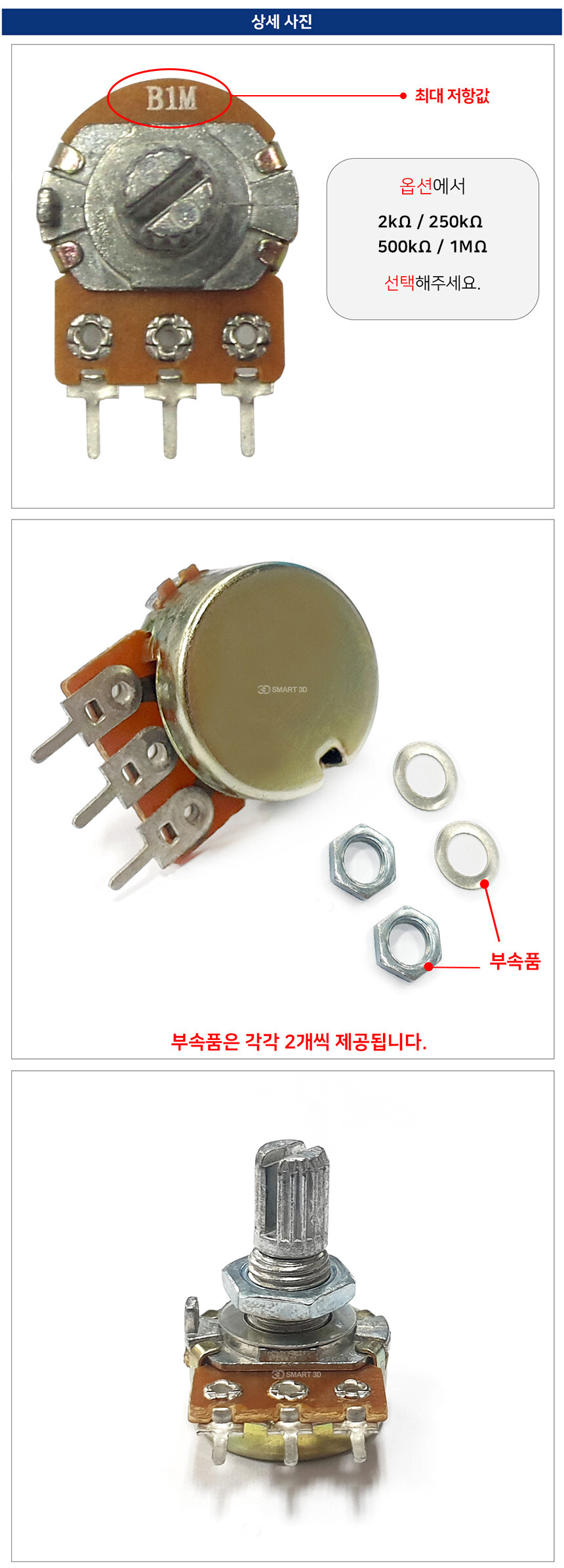 해당 제품의 옵션은 2kΩ, 250kΩ, 500kΩ, 1MΩ으로 구성되어 있으며 연결부도 함께 제공됩니다.