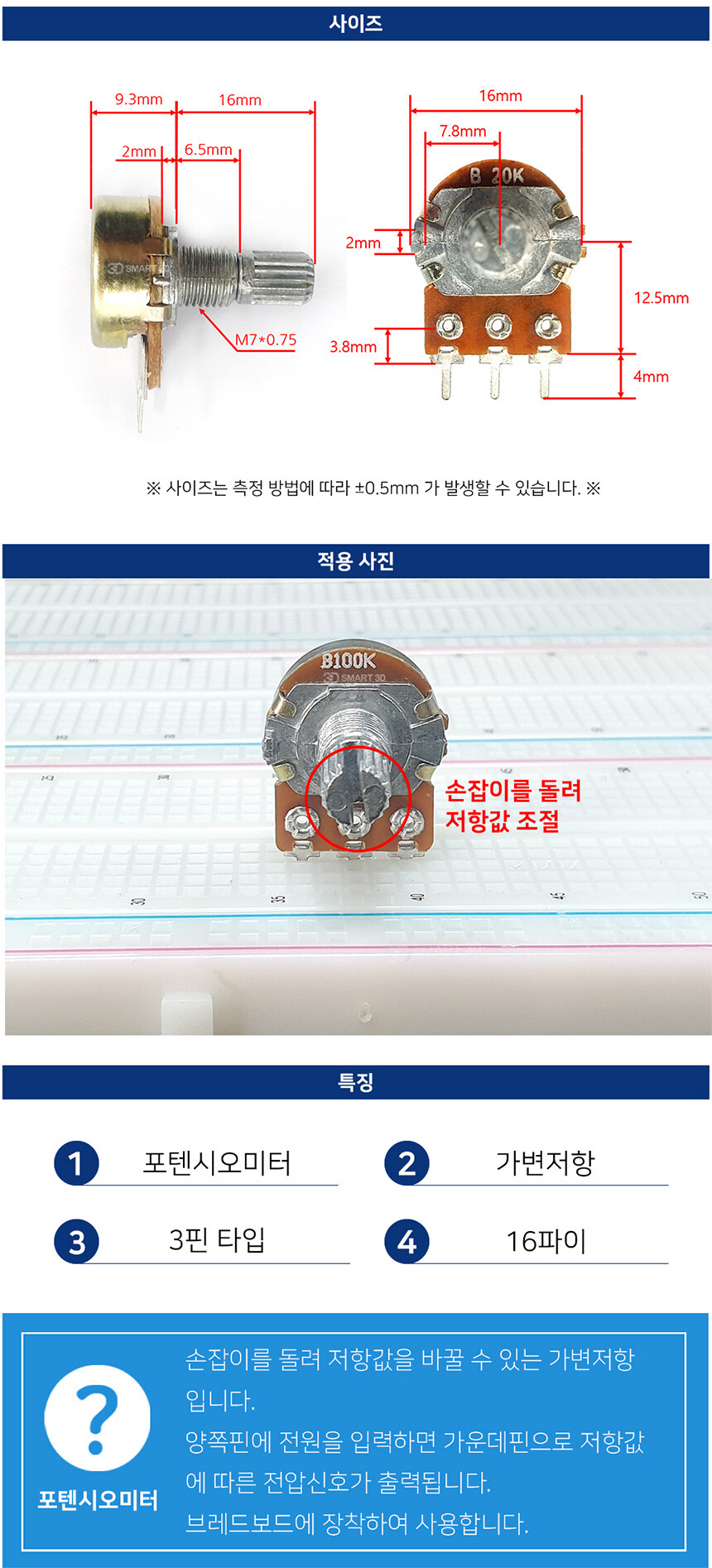 손잡이를 돌려 저항값을 바꿀 수 있으며 최대 저항값은 제품 뒷면에 기재되어 있습니다.