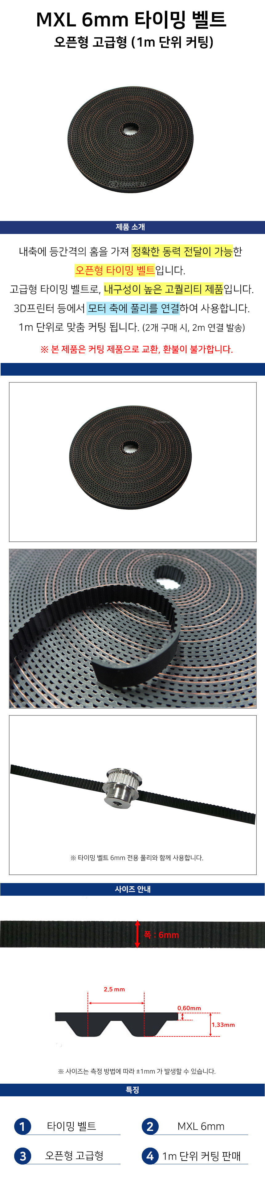 MXL 6mm 타이밍 벨트 오픈형 고급형 1m 단위 맞춤형 커팅 (Open type) 3D프린터 풀리 호환 열림형 스마트3D