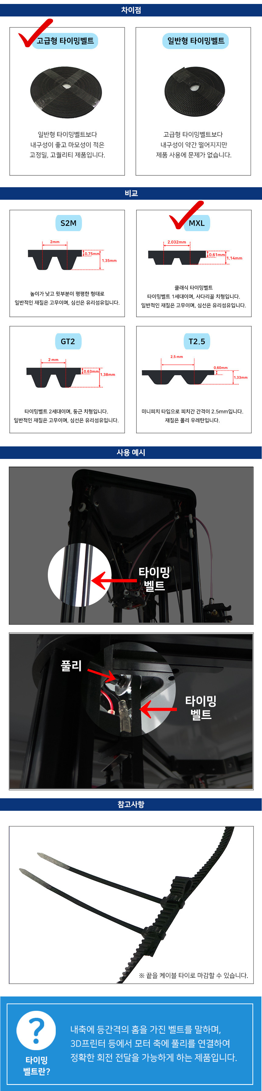 고급형 타이밍 벨트로, 내구성이 높은 고퀄리티 제품입니다. 3D프린터 등에서 모터 축에 풀리를 연결하여 사용합니다.