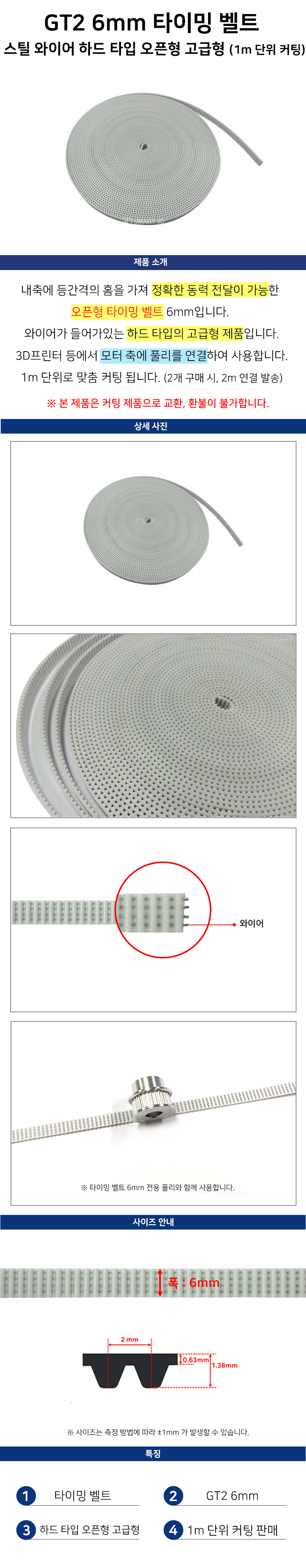 GT2 6mm 스틸 와이어 하드 타입 오픈형 고급형 타이밍 벨트 1m 단위 맞춤형 커팅 (Open type) 3D프린터 풀리 호환 열림형 스마트3D