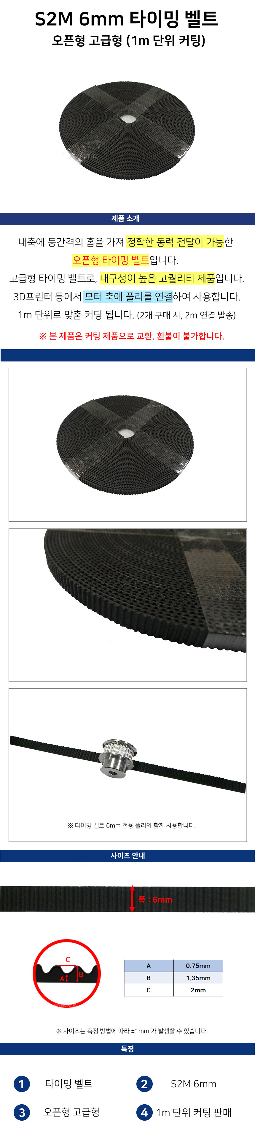 S2M 6mm 타이밍 벨트 오픈형 고급형 1m 단위 맞춤형 커팅 (Open type) 3D프린터 풀리 호환 열림형 스마트3D