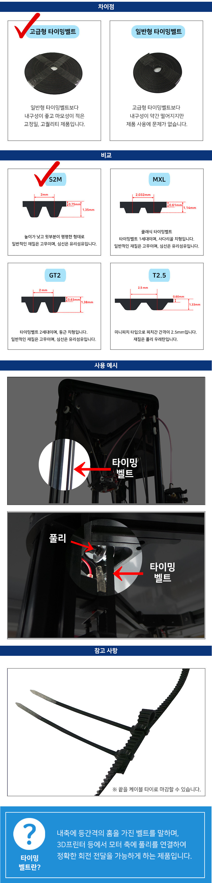 고급형 타이밍 벨트로, 내구성이 높은 고퀄리티 제품입니다. 3D프린터 등에서 모터 축에 풀리를 연결하여 사용합니다.