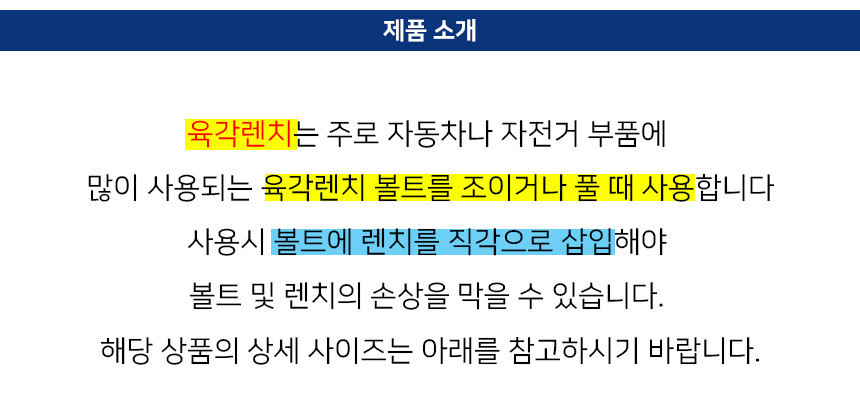 육각 렌치는 주로 자동차나 자전거 부품에 많이 사용되는 육각렌치 볼트를 조이거나 풀 때 사용합니다.